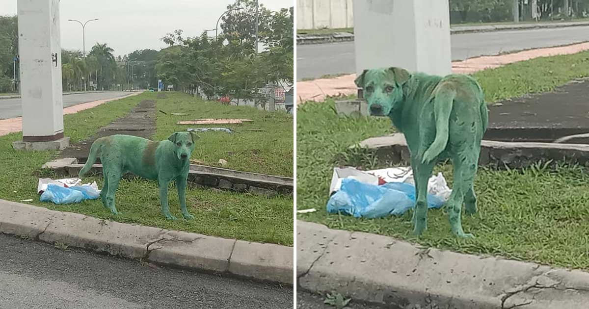 Denne hunden ble funnet i Petaling Jaya, Malaysia. Da han ble funnet hadde han blitt malt grønn og forlatt utendørs for å klare seg selv.