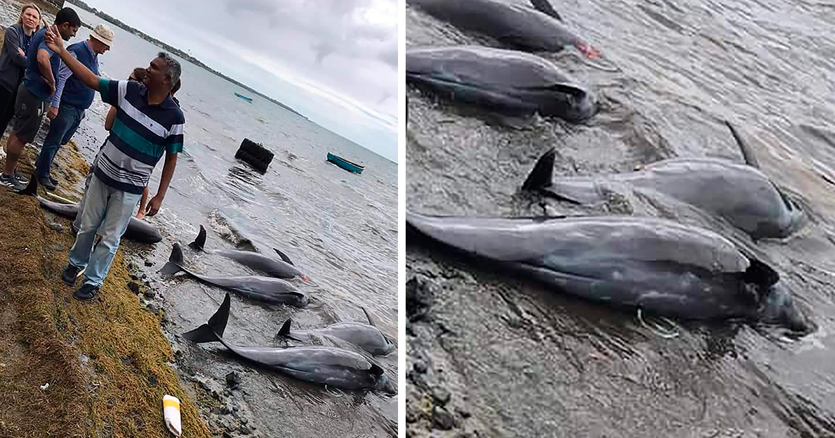 In this photo supplied by Greenpeace on Wednesday, Aug. 26, 2020, dolphins lay dead on the shore on the Indian Ocean island of Mauritius. At least 14 dolphins have washed up and died on the coast of the Indian Ocean island of Mauritius, where a Japanese ship ran aground and spilled more than 1,000 tons of fuel, report environmental groups and experts. (Eshan Juman/Greenpeace via AP/TT